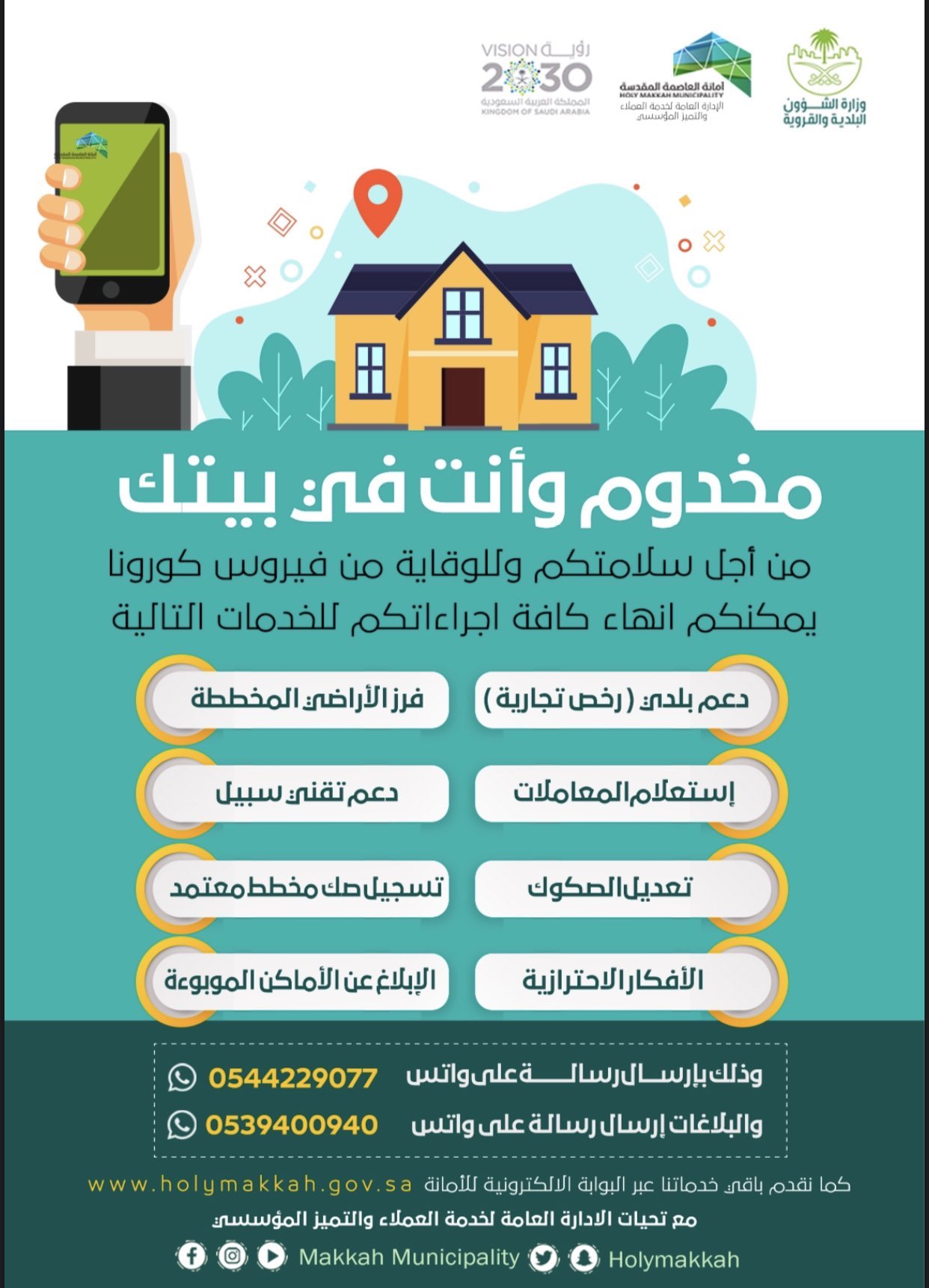 أمانة العاصمة المقدسة در توییتر مخدوم وأنت في بيتك وذلك بإرسال رسالة على برنامج التواصل الإجتماعي واتساب 0544229077 وللبلاغات 0539400940 خليك بالبيت معا لأمانة رقمية البلديات تكافح كورونا فيروس كورونا Saudiatv Https T Co Wz1ihpt4ff